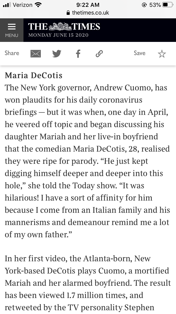 “Take actor-comedian Maria DeCotis, who recently posted a brief skit to Twitter in which she plays New York Governor Andrew Cuomo talking about his daughter Mariah’s boyfriend. DeCotis plays all three characters, lip-syncing to Cuomo’s bumbling speech about how fathers have to pretend to like their daughters’ boyfriends.”